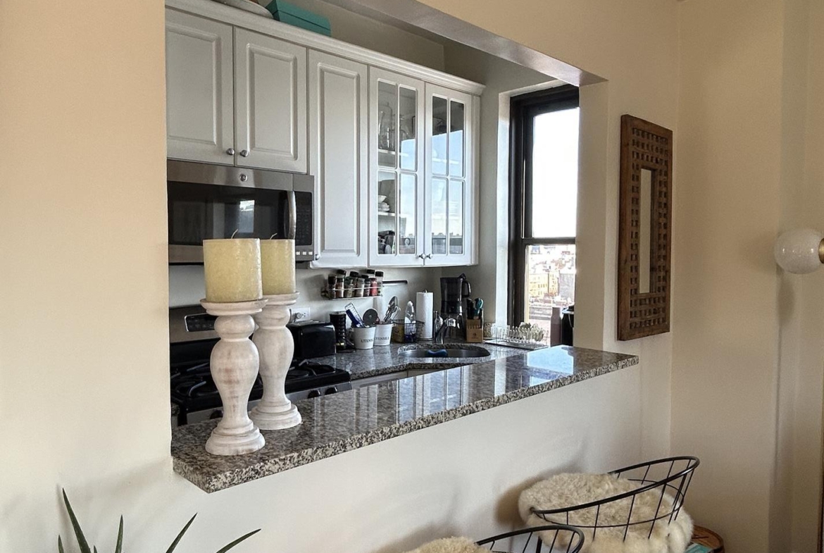 Huge one-bedroom with wide open views and lots of light. This apartment has several windows in every room and is very bright. Living room fits a sectional sofa and full dining table or lots of options for work from home. The windowed kitchen has stainless appliances, granite countertops, dishwasher, microwave, and a breakfast bar. Bedroom can fit a king sized bed and dresser and another desk. Excellent closet space.