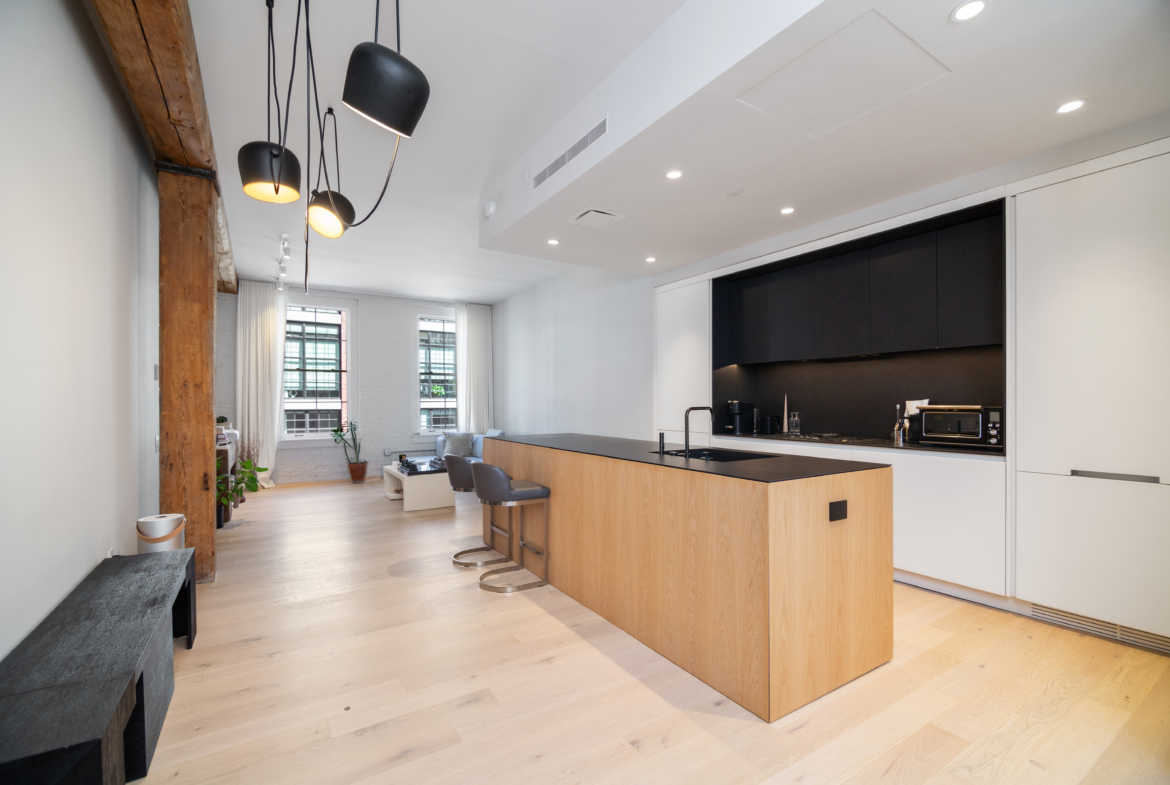 Once inside, you are greeted by soaring 11-foot ceilings, a large open kitchen, dining area and living area that is bathed in natural light courtesy of the seven-foot-tall windows that offer picturesque views of sky and the classic warehouses Dumbo is known for.