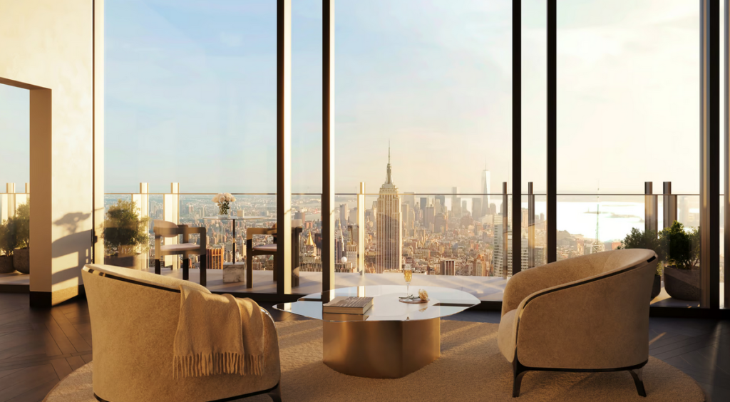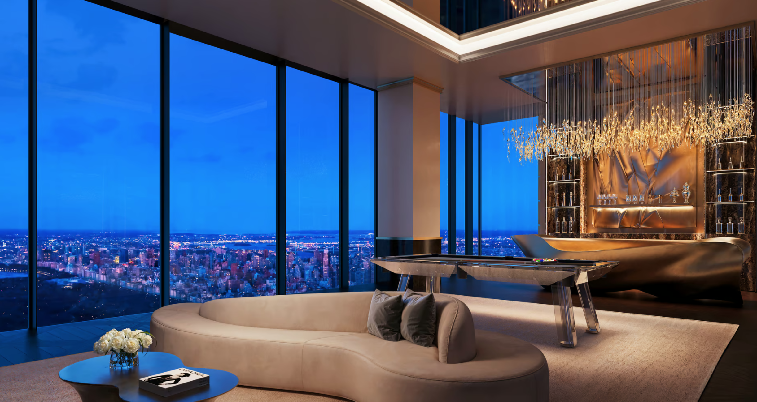 Spanning 11,480 square feet across the tower’s top four levels, the residence features five bedrooms, six bathrooms, multiple lounges, and a private elevator. A 618-square-foot terrace offers sweeping views of Central Park, completing the ultra-luxurious offering.