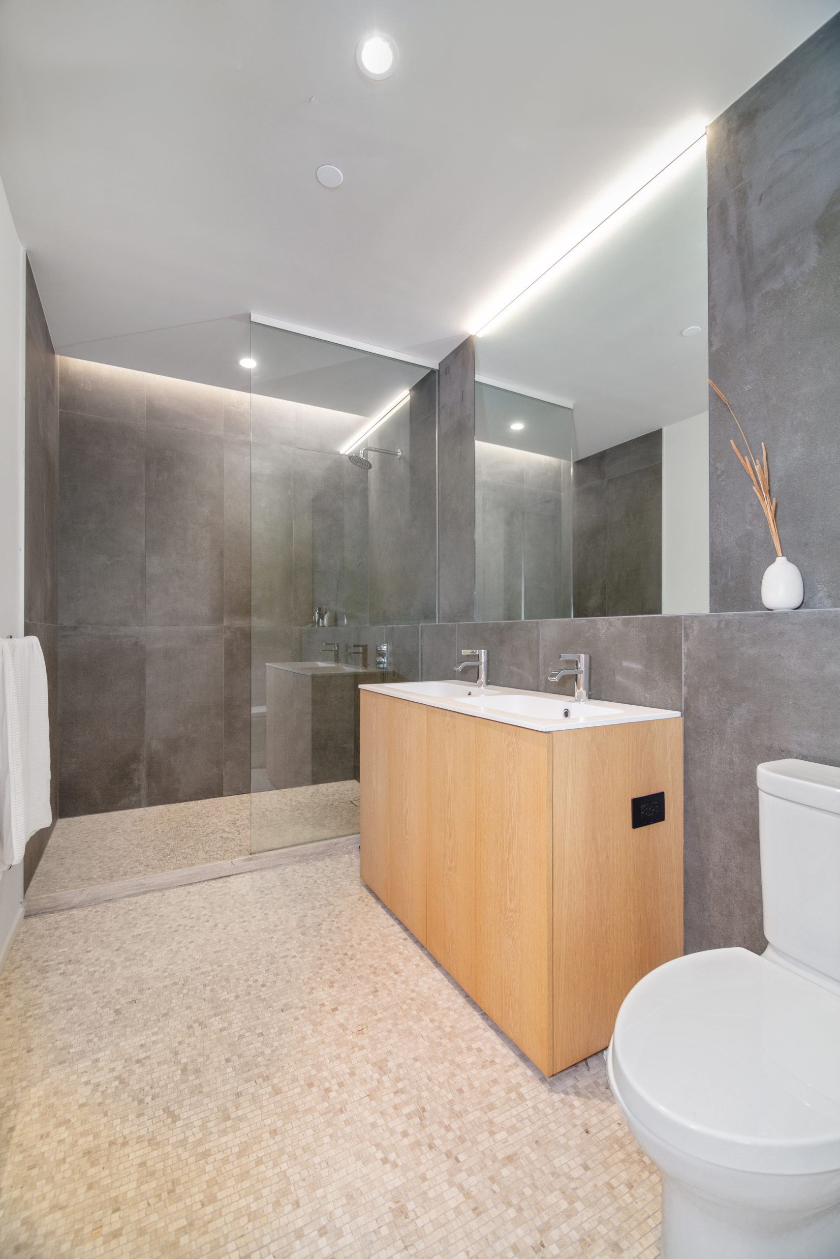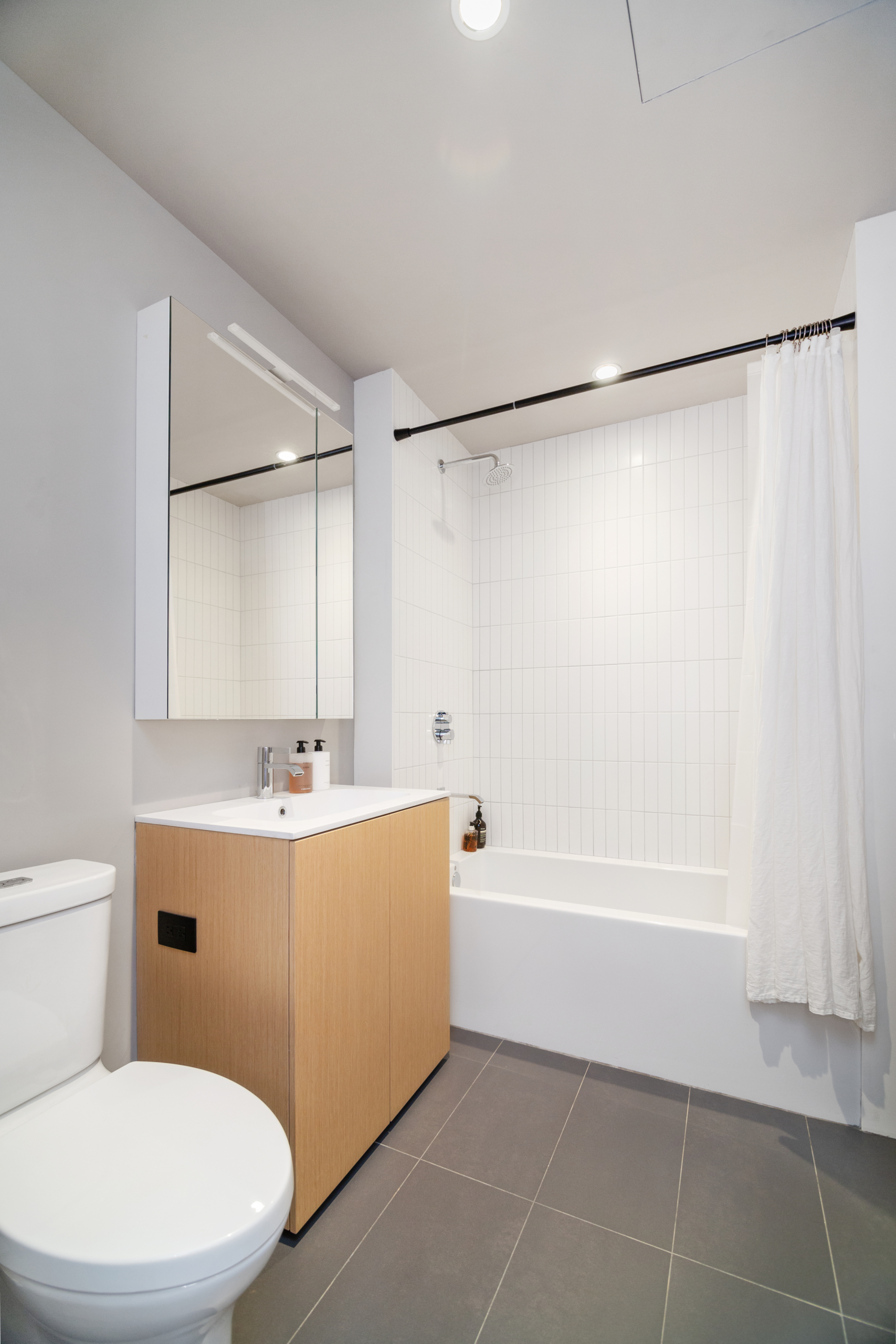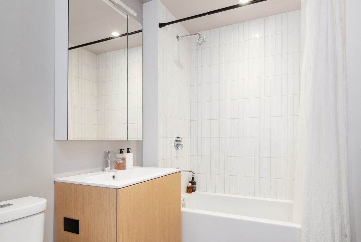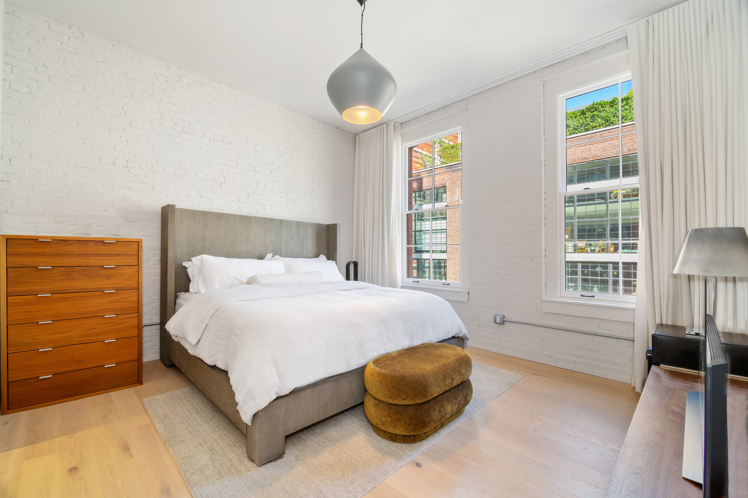 The king sized primary suite is flanked by a wall of restored white brick, coupled with large northern facing windows making the room bright and airy. A large walk-in closet provides ample storage space for all your belongings. The incredible primary ensuite bathroom showcases custom Haisa hand-clipped marble mosaic floor, a walk-in stone shower, and Dornbracht fixtures. A RiFRA bleached white oak vanity and large heather grey porcelain wall tiles adds to the overall spa-like aesthetic. You will also find a full-height built-in mirrored medicine cabinet for all your storage needs. The unit has ample storage and closet space throughout!