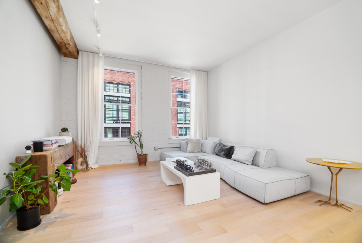 Once inside, you are greeted by soaring 11-foot ceilings, a large open kitchen, dining area and living area that is bathed in natural light courtesy of the seven-foot-tall windows that offer picturesque views of sky and the classic warehouses Dumbo is known for.