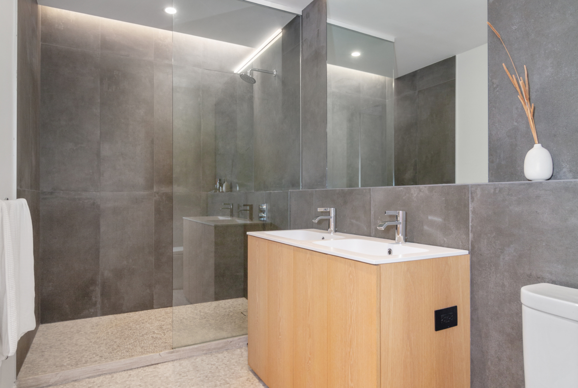 The minimalistic open kitchen features custom-designed RiFRA Italian cabinets, a large kitchen island, and porcelain stone countertops with an integrated sink. Top-of-the-line Miele appliances include a fully integrated refrigerator, built-in oven, 36″ 5-burner gas cooktop, dishwasher, garbage disposal, a concealed recirculating cooking exhaust hood and TONS of storage. Just off the kitchen you will find a full laundry room with an in-unit washer/dryer. Additionally the unit is Fios and Lutron ready for seamless connectivity throughout the home.