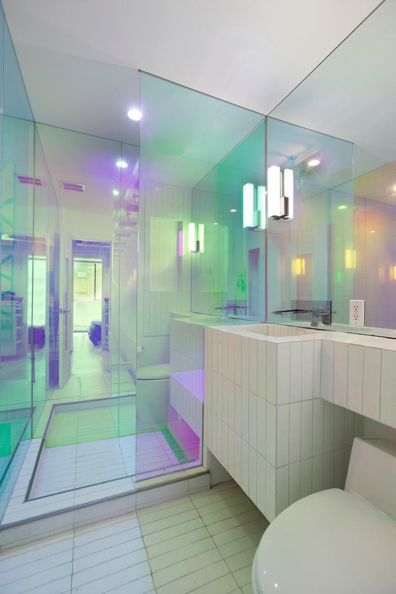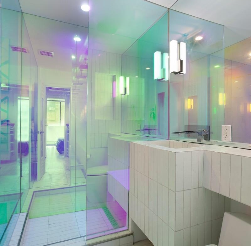 Just up the stairs you will find a quiet bedroom oasis on the back of the building, large enough for a king-sized bed and additional furniture. WITH NEW FROSTED GLASS! Adjacent there is a custom built, walk-in closet. The newly renovated upstairs bathroom, designed by Brandt Haferd Architects, features show stopping, dichroic glass with a walk-in shower.
