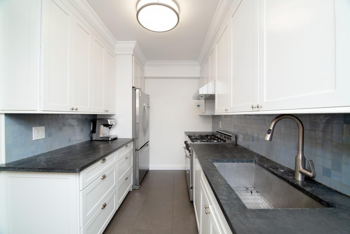 Move right in to this flawless two bedroom, two bathroom with washer/dryer and low maintenance. The renovated kitchen features white shaker cabinets, Pietra Cardosa counters, stainless steel appliances, and a panel-front Bosch dishwasher. It has been extended with counter seating, lots of countertop space, and tons of storage with cabinets to the ceiling. A full sized dining table for 6-8 people can be accommodated with ease in the dining area. The sunny, south-facing living room is very spacious, accommodating all living room furniture and even space for a desk. The massive entry closet functions as both coat closet and pantry or extra storage with custom cabinetry. All seven closets in the apartment feature California Closet buildouts making organization a breeze.