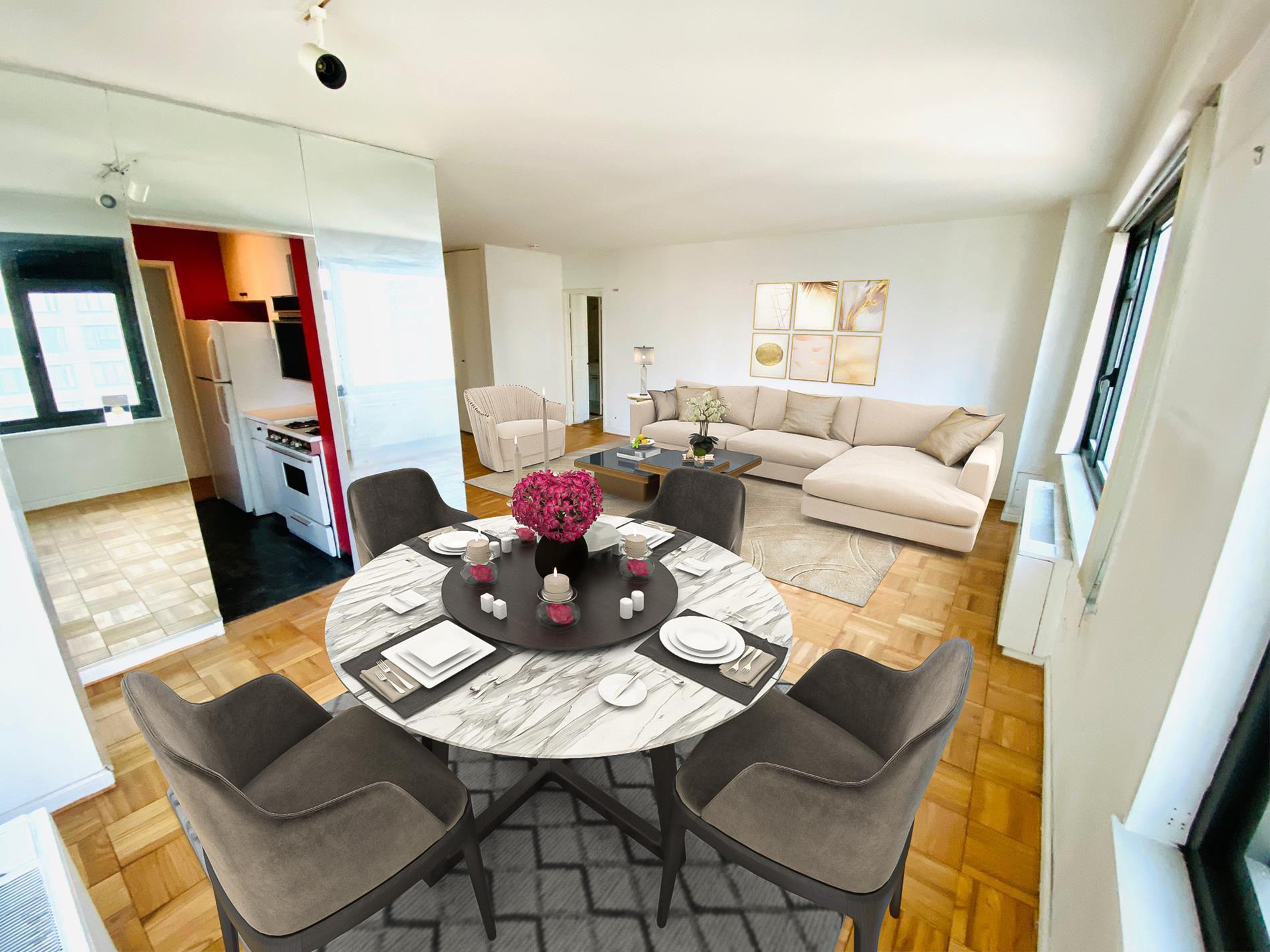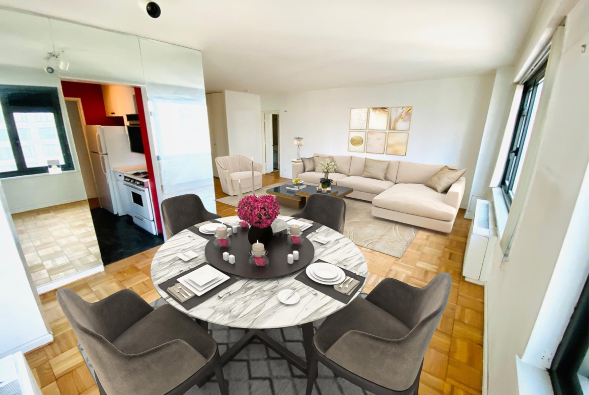 ESTATE SALE OPPORTUNITY AT THE PHOENIX. This affordable, oversized Junior 4 room apartment (convertible 2 bedroom) featuring a grand living room with a large alcove dining area can now be yours. Bring your designer and transform this into your new home or into the perfect pied e terre. If a Powder Room is a must ….it’s here! There are open Eastern & Southern Skyline views of New York. Renovate to your taste and have it all. 75% Financing Permitted. 2% Transfer Fee