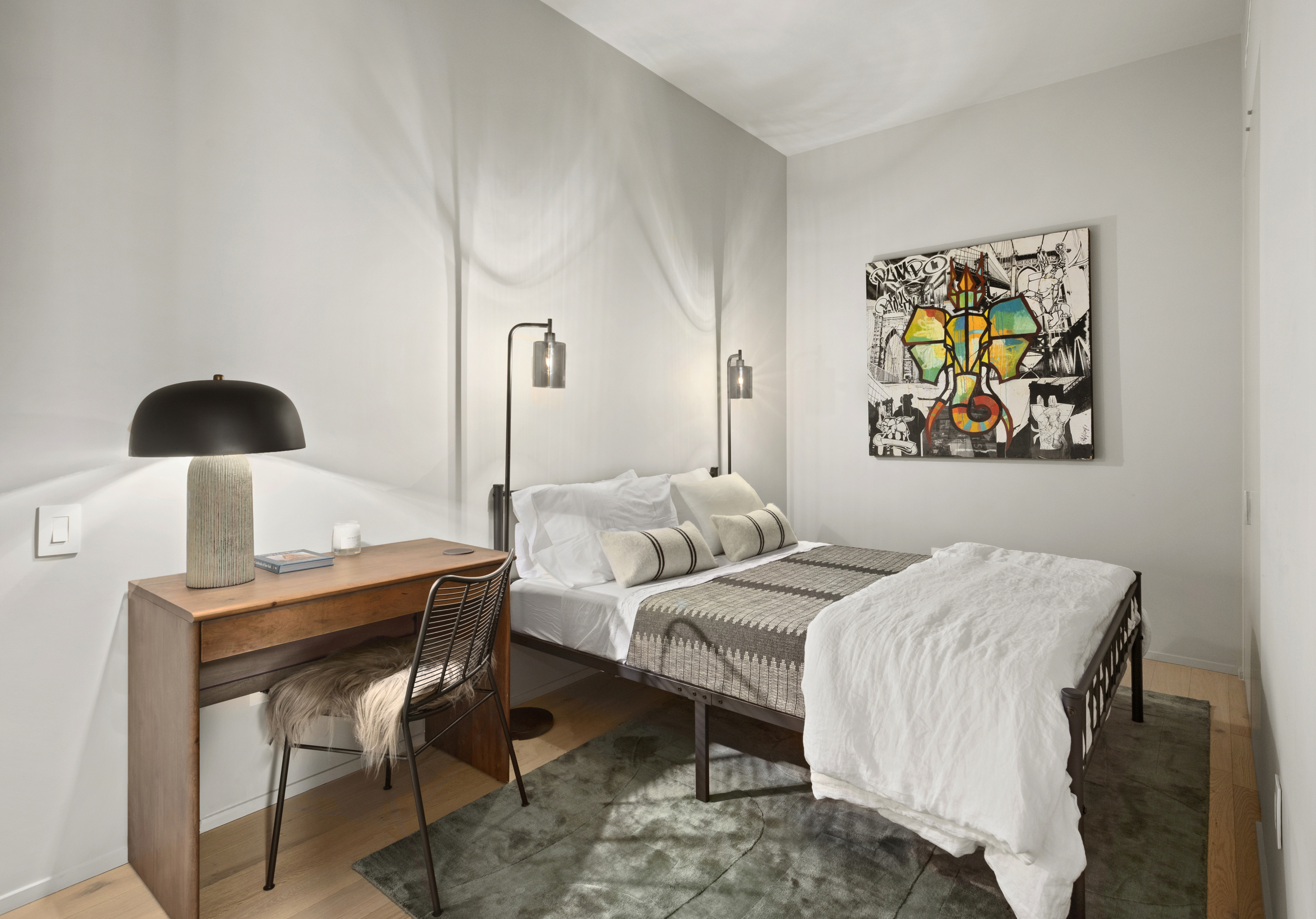 The king sized primary suite is flanked by a wall of restored white brick, coupled with large northern facing windows making the room bright and airy. A large walk-in closet provides ample storage space for all your belongings. The incredible primary ensuite bathroom showcases custom Haisa hand-clipped marble mosaic floor, a walk-in stone shower, and Dornbracht fixtures. A RiFRA bleached white oak vanity and large heather grey porcelain wall tiles adds to the overall spa-like aesthetic. You will also find a full-height built-in mirrored medicine cabinet for all your storage needs. The unit has ample storage and closet space throughout!