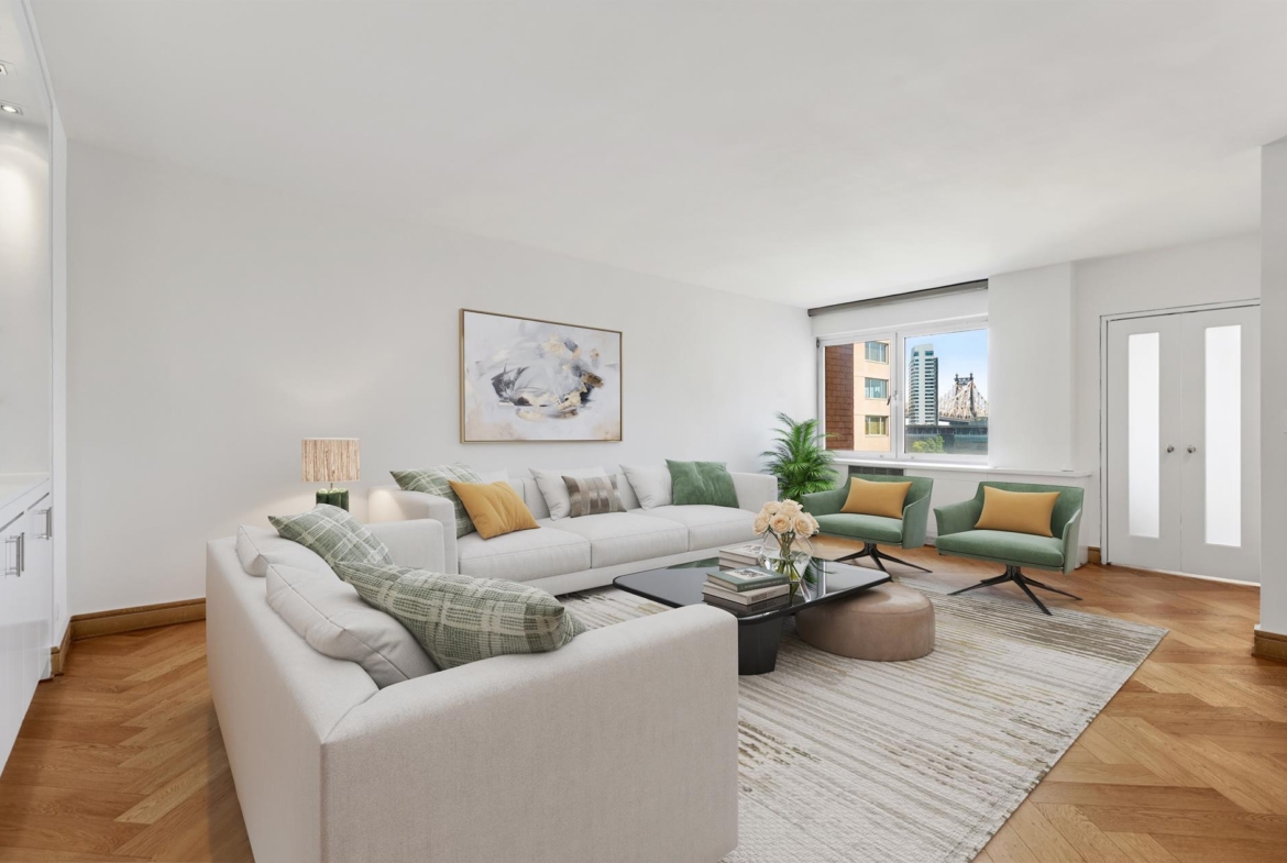Presenting a River View, Move-In condition Estate Sale opportunity at Cannon Point North. This oversized (approximately 1000 sq ft) 1 bedroom, 1 1/2 bathroom apartment features stunning East River Views from the Living Room. Upon entering apartment 6L, you will immediately notice how spacious the open plan living and dining area are. The bedroom with en-suite bathroom and large walk in closet can easily take on King Size bedding and furniture. The Dining Area will allow you to host a dinner for 8. Recent renovations included solid wood, Herringbone flooring throughout. The bathrooms and kitchen are in excellent condition. The storage and closet space is superb. Freshly painted and ready for new ownership. The price is right and the monthly maintenance which includes gas and electric is low. Cable and Internet are bulk purchased. This is the perfect Sutton Place home or pied e terre!