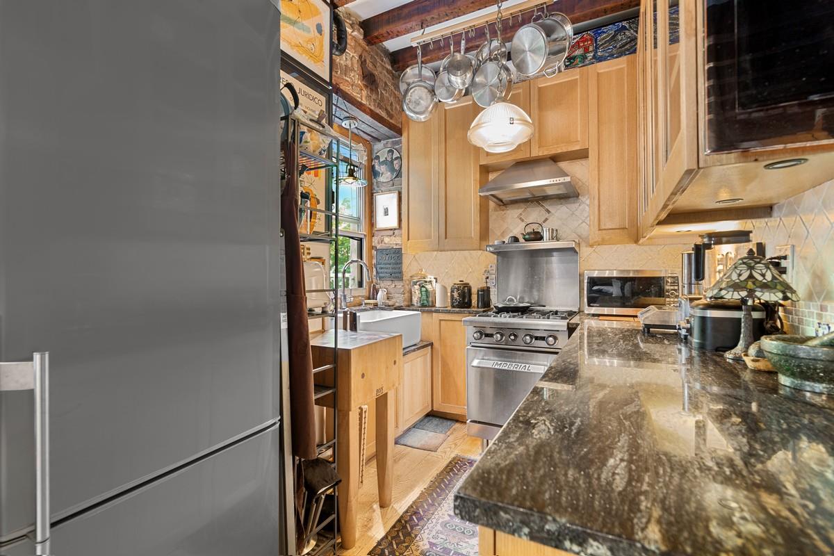 As you traverse through a small foyer you are greeted by 12 foot original wood-beamed ceilings, a wall of exposed brick, and beautiful 5 inch oak panel flooring. The unit benefits from amazing air and light with three new massive commercial-grade windows (one that is fully retractable), framed with industrial steel beams that overlook a lush garden with mature plantings.