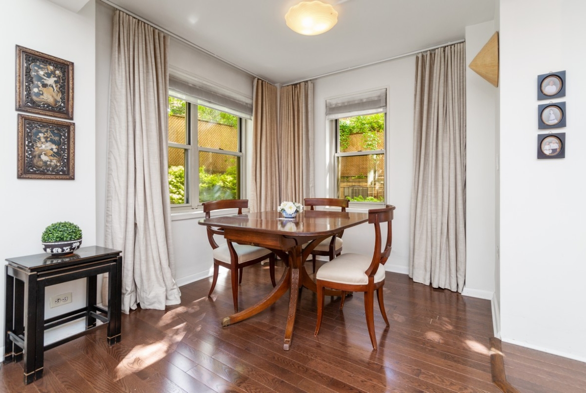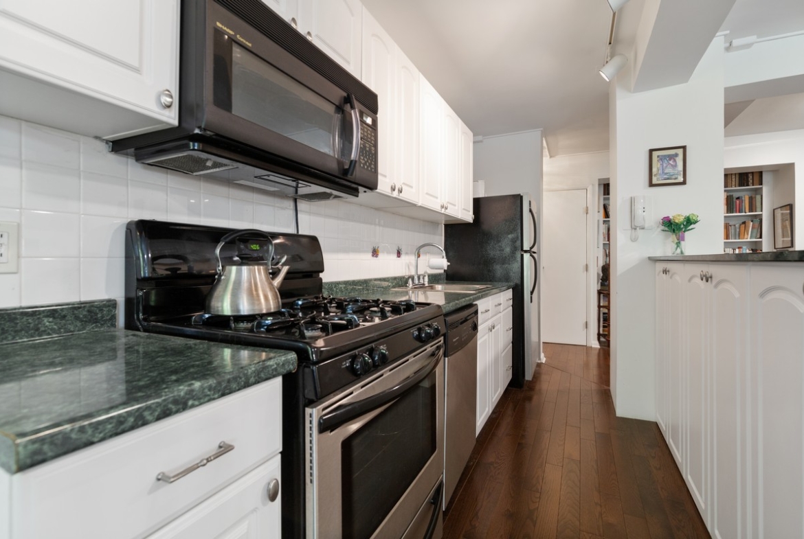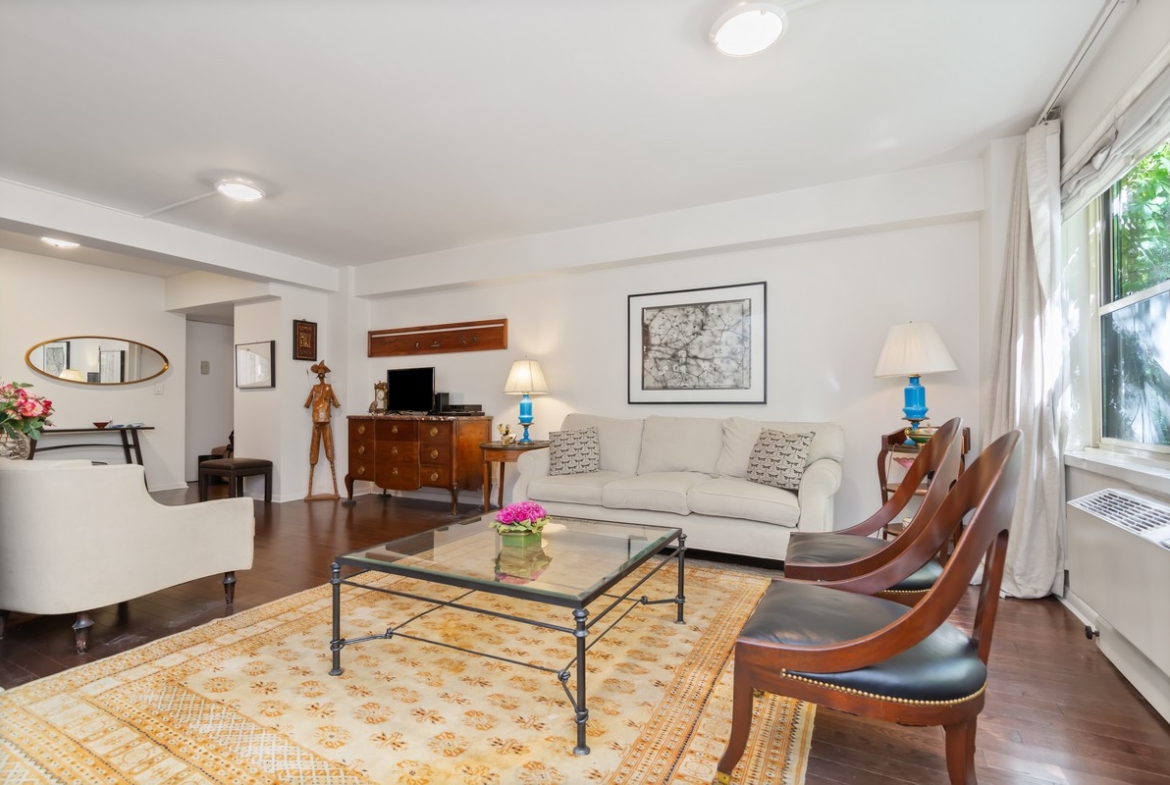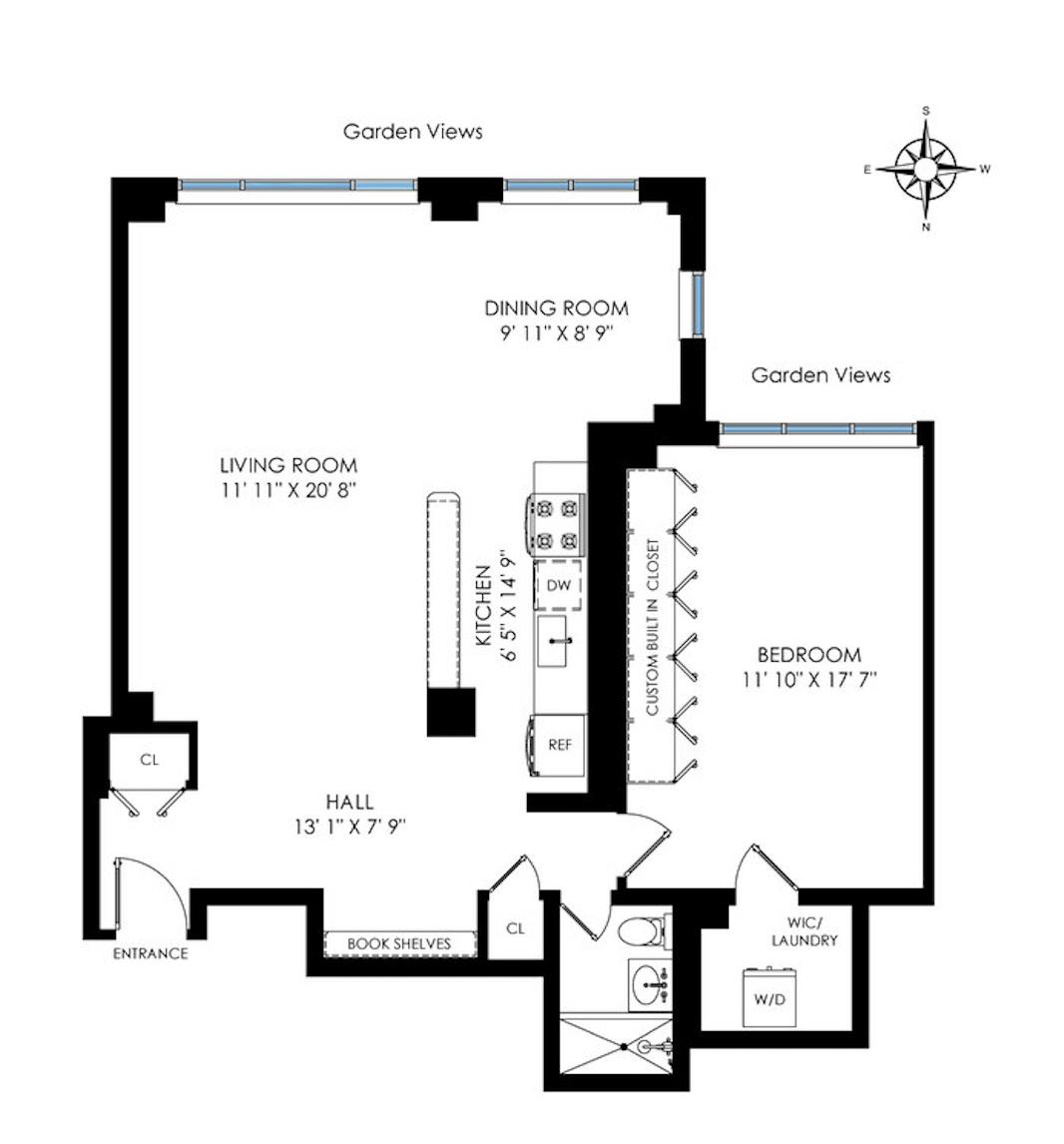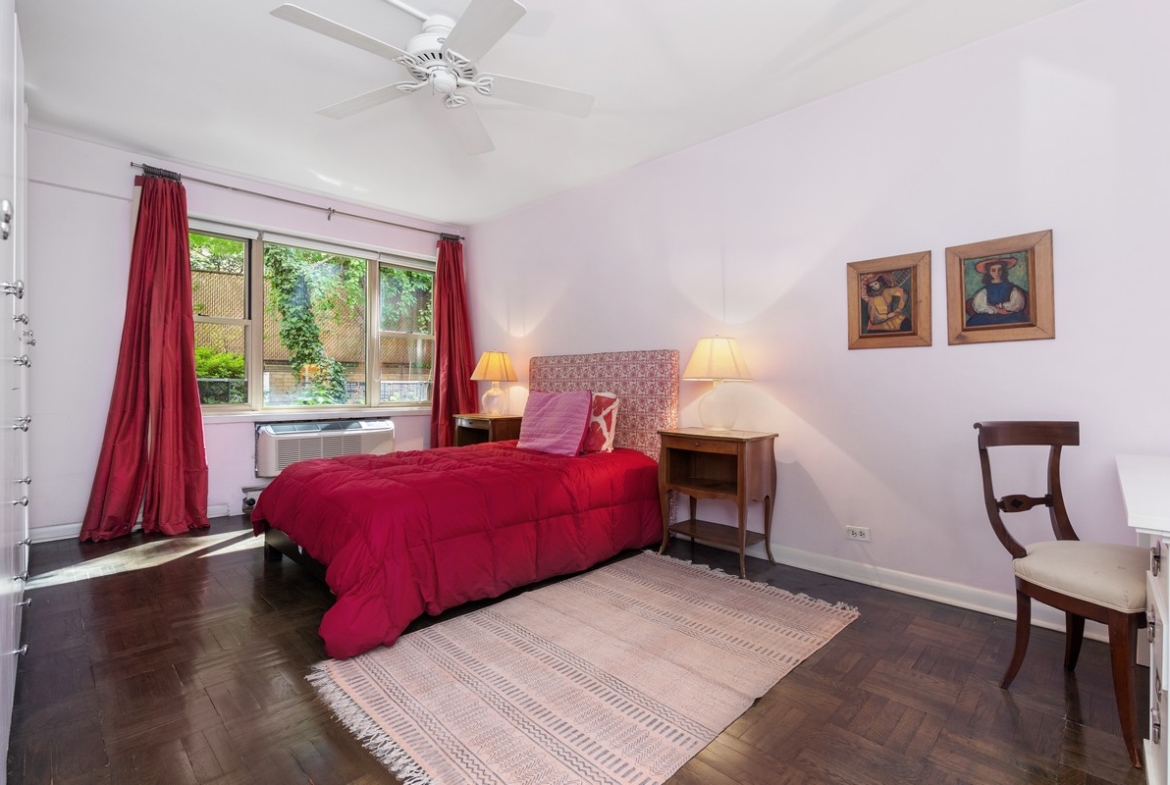 Picturesque, quiet, garden view apartment at the coveted Sutton House! No need for window units obscuring the lovely view as the apartment has through-the-wall AC. This spacious convertible-2 has a very open layout with the kitchen overlooking the substantial living room. Dark, long board can be found throughout the living space, with other nice details such as additional overhead lighting and built-in bookcases. The bathroom features a walk-in shower and marble tile. The bedroom is large and features a full wall of built-in closets. The cherry on the cake is the welcome anomaly of a washer/dryer, which is usually only reserved for larger apartments in the building. (Bedroom virtually staged)