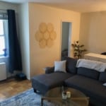 Upon entering the apartment you are welcomed by an open kitchen and living area with high ceilings flanked by a wall of exposed brick. The open, epitome of chic, fully equipped chef’s kitchen is comprised of a large quartz waterfall countertop with breakfast bar for seating, a 4-burner Bertazzoni cooking range, built-in microwave, Summit refrigerator, a dishwasher, and an abundance of cabinet storage. The unit comes equipped with track and recessed lighting throughout with multiple control and light settings. Off the kitchen there is a large living room flooded with bright natural light that can easily accommodate generous areas for sitting and dining.
