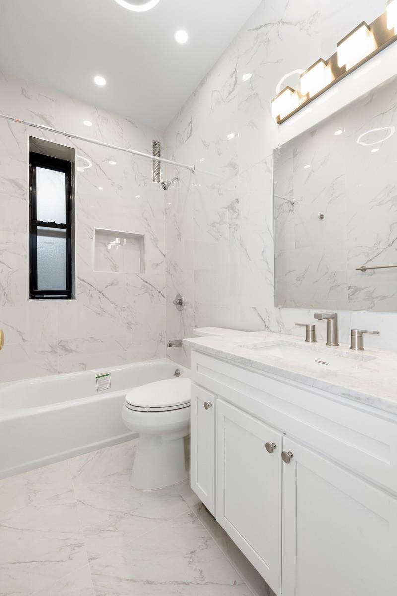 Come home to a massive gut-renovated oasis where no expense has been spared. Entering the apartment, you immediately notice the loft-like layout with 9 foot ceilings and large light-flooded windows. The open layout flows seamlessly into a large sun-drenched living room with new hardwood flooring with recessed lighting throughout. The chef’s kitchen features brand-new stainless-steel appliances, dishwasher, a new stone floor, abundant cabinet storage, and a washer/dryer. The bathroom has been completely redone in marble, and comes equipped with new light fixtures and a LED lit mirror.