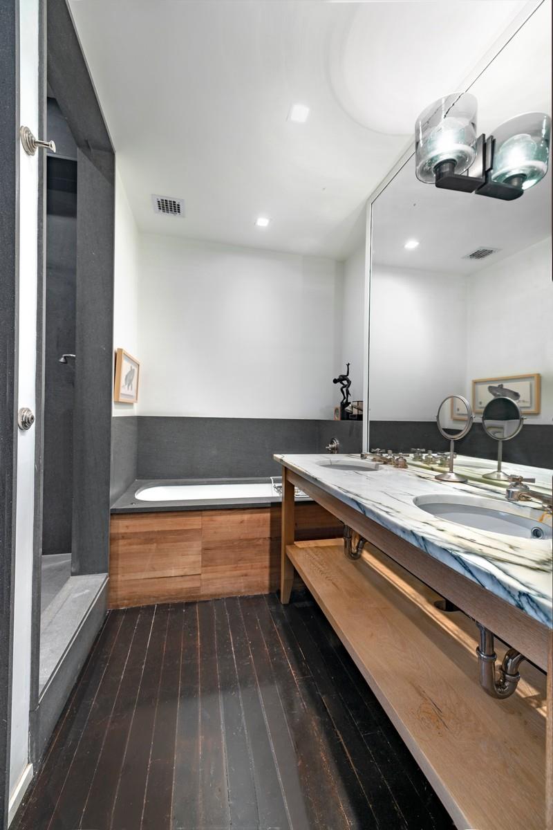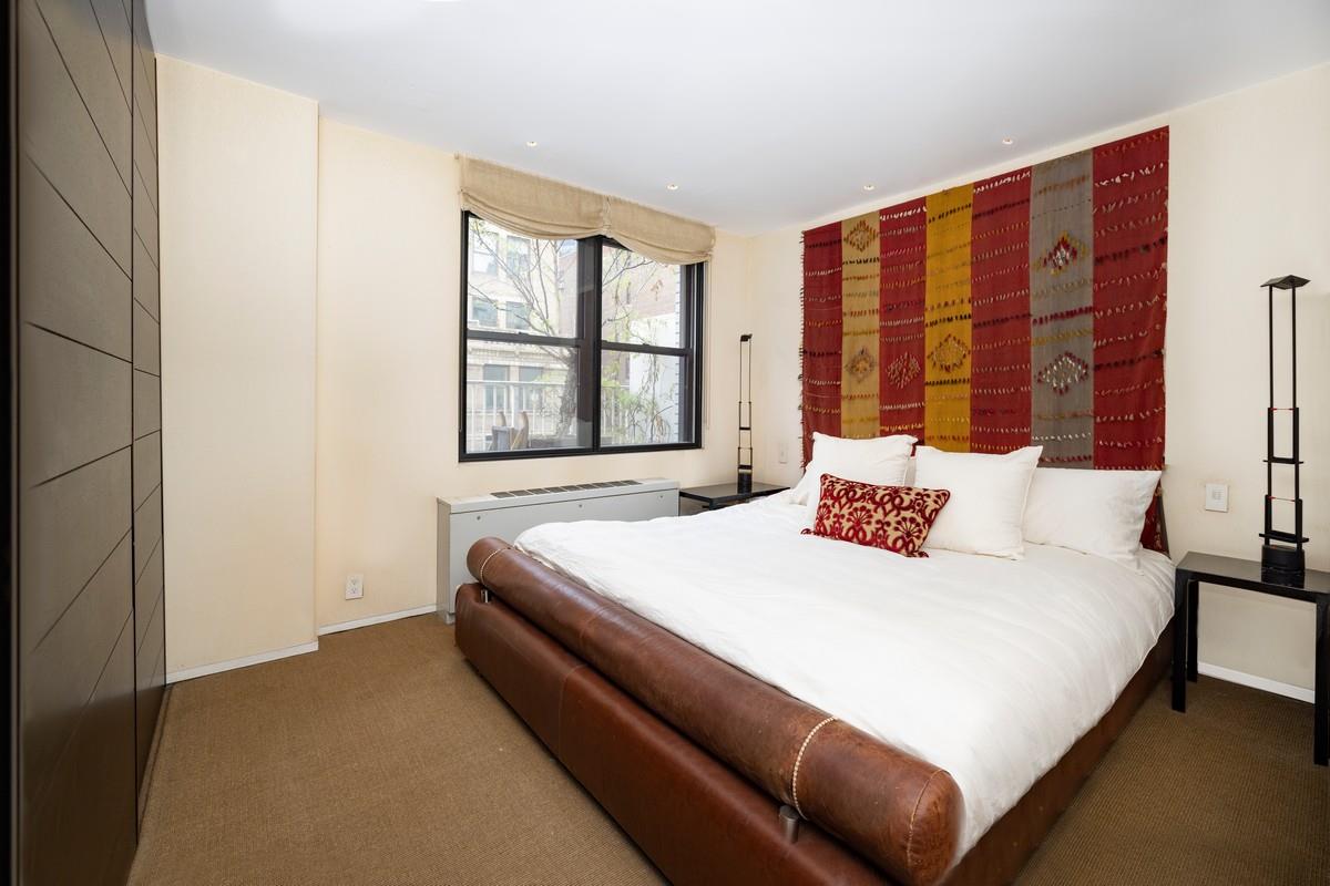 As you traverse a hallway accented with cashmere wallcovering, you come to the secluded master suite outfitted with recently installed sisal carpeting, linen shades, and three large Poliform custom closets, all overlooking the terrace. The en suite bathroom consists of rich slate stone, double Waterworks sinks surrounded by white Arabescato marble, a 12 foot slate rainfall shower, and a deep Whirlpool soaking tub displaying spa-level finishes throughout. The second bedroom is equally as spacious with a large custom closet and is conveniently located next to the second full bathroom, which boasts a deep whirlpool soaking tub, wall-mounted Duravit toilet and marble throughout.