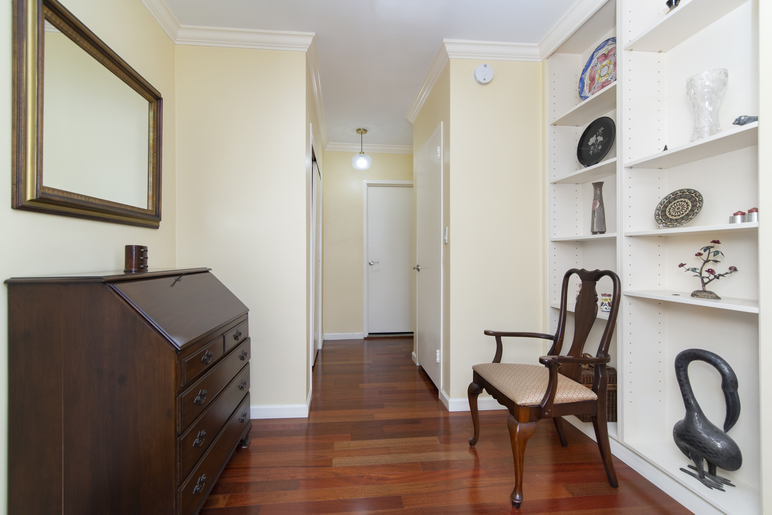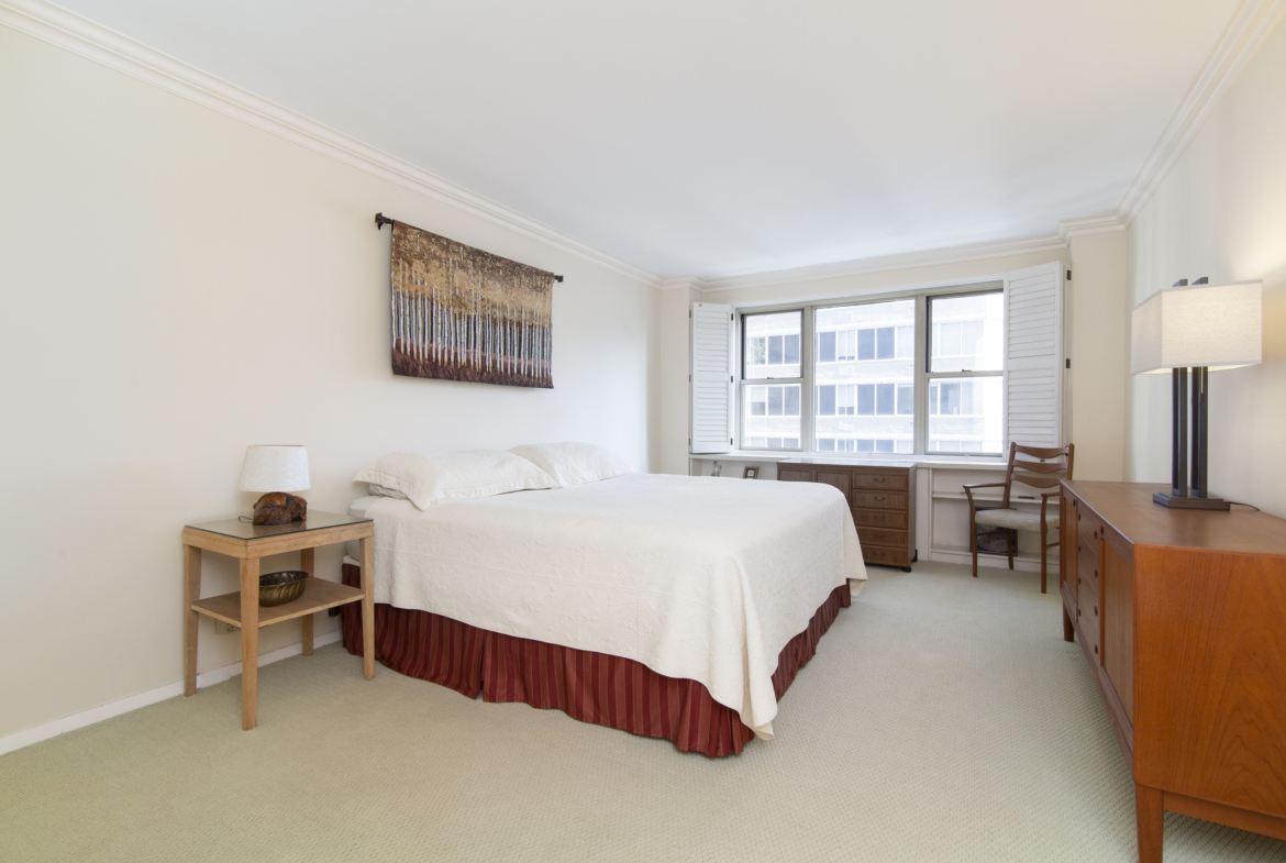 Love the light and side river view from this high floor, convertible two bedroom at the Sutton House! Oversized entry foyer doubles perfectly as a home office for a comfortable work from home lifestyle. White cabinets and a solid granite counter and backsplash are highlights of the sizable kitchen with storage to the ceiling. The enormous bedroom can fit any furniture you may desire and also has a huge walk-in closet. The apartment features exceptional millwork, from built-ins to bookcases, crown molding, and bedroom shutters. Significant closet space, long board flooring, HVAC, and a ceiling fan are a few more of the many mentionable features.