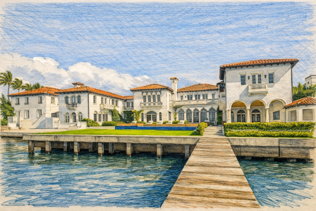 A reimagined 1920s estate with 200 feet of Intracoastal frontage, private dock, tennis court, infinity pool, and full performing arts theater.