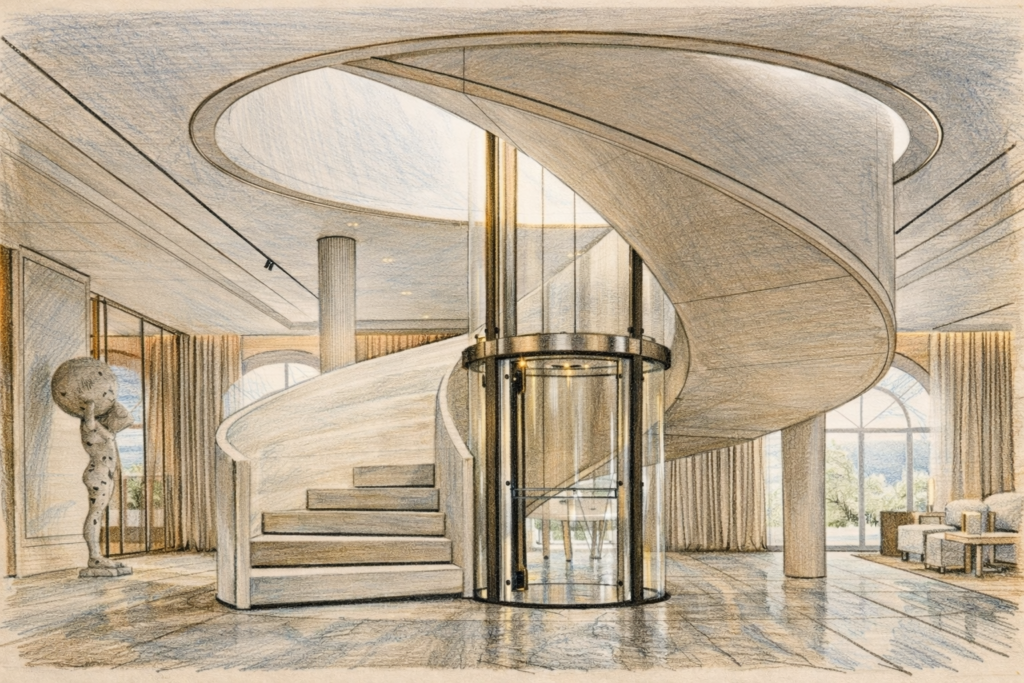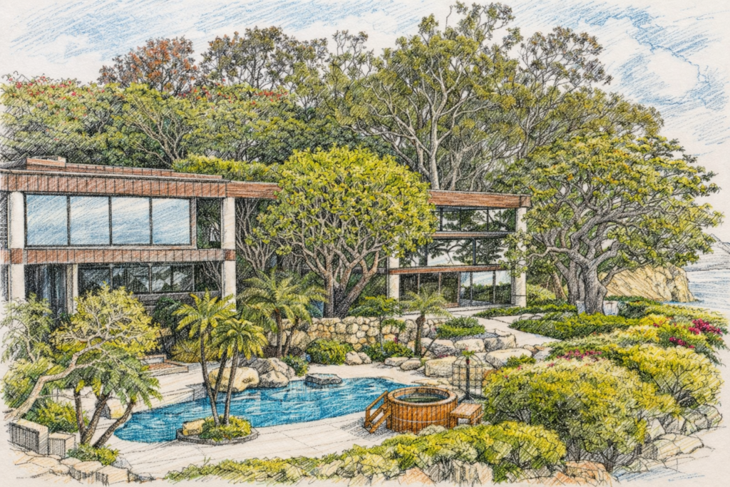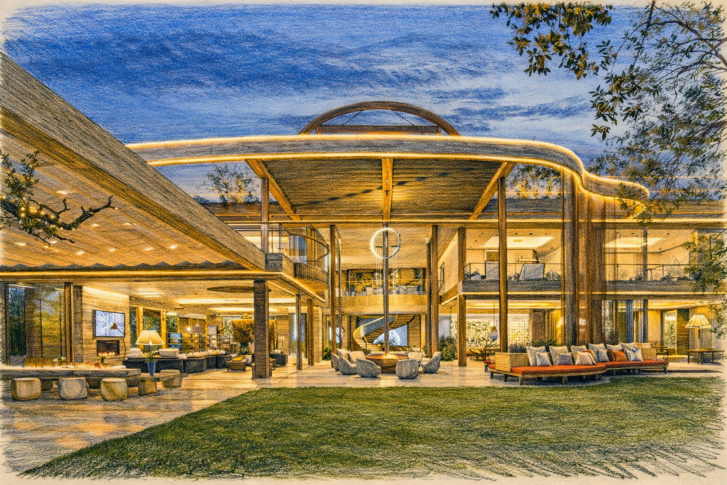 A futuristic, resort-like megamansion featuring glass walls, water features, a private jazz club, rooftop pool, and immersive wellness amenities.