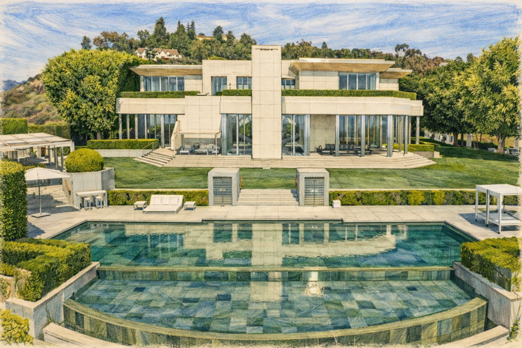 An Ed Tuttle-designed contemporary compound with 27 bathrooms, a bowling alley, wellness center, safe room, and panoramic views of the entire Los Angeles Basin.
