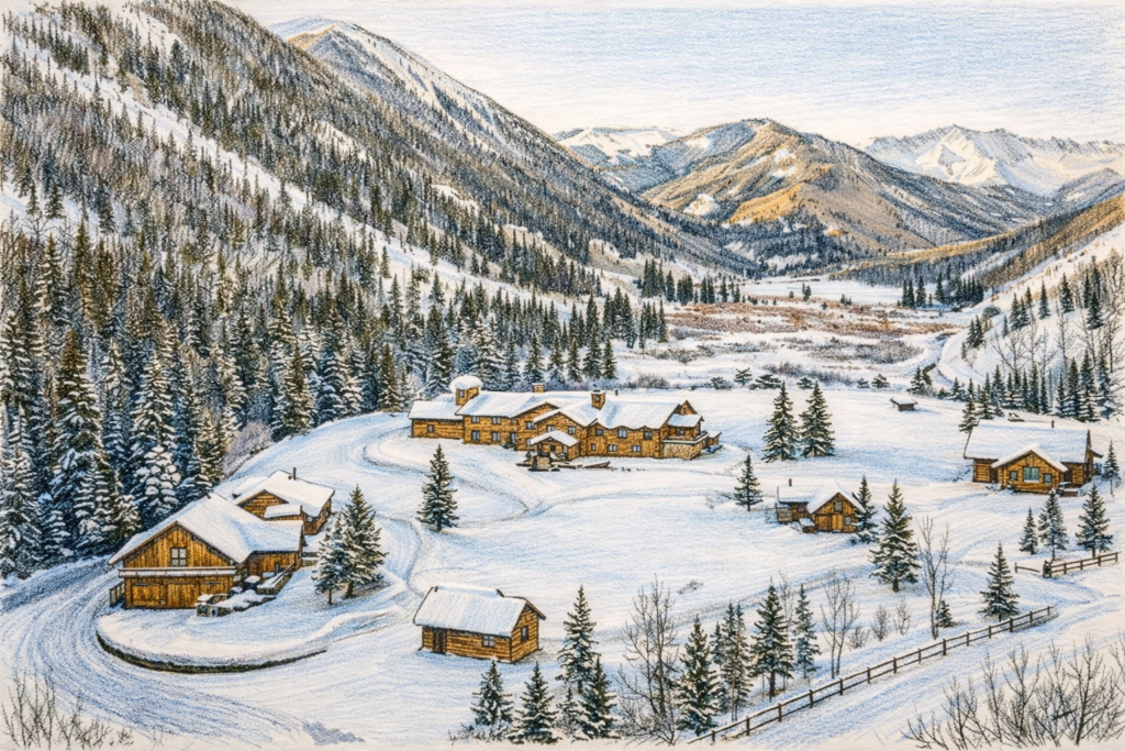 A secluded 53-acre Aspen compound with a main residence, guest cabins, fitness center, ponds, and rustic-luxury interiors just minutes from downtown.