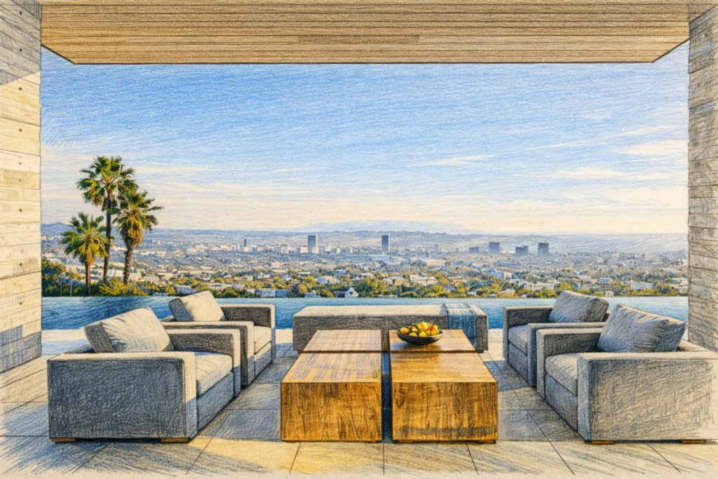 A newly built concrete and glass masterpiece near the Hollywood Bowl, offering panoramic city-to-ocean views, a ballroom-style garage, and museum-grade construction.