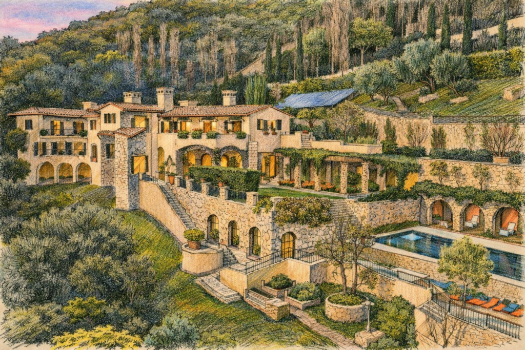 A Moroccan-influenced estate overlooking the Bel-Air Country Club, filled with European antiques, courtyards, fountains, a private chapel, and a dramatic 130-step outdoor staircase.